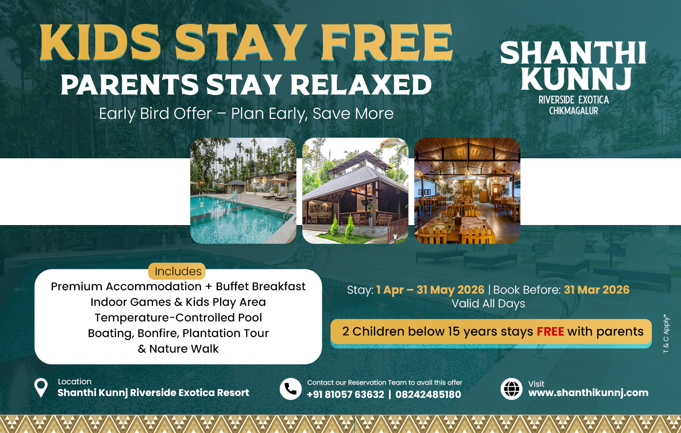 Treat your eyes to nature surrounding and may your soul cherish the scenic beauty around. It is a hand-picked area amongst the coffee plantation along the Western Ghats of Karnataka. The region is rich in panoramic surprises with hills, waterfalls, beautiful valleys, spring water streams, coffee & tea estates and more. All without compromising on the comforts of a resort with modern facilities, just about 2 kms from the main road.